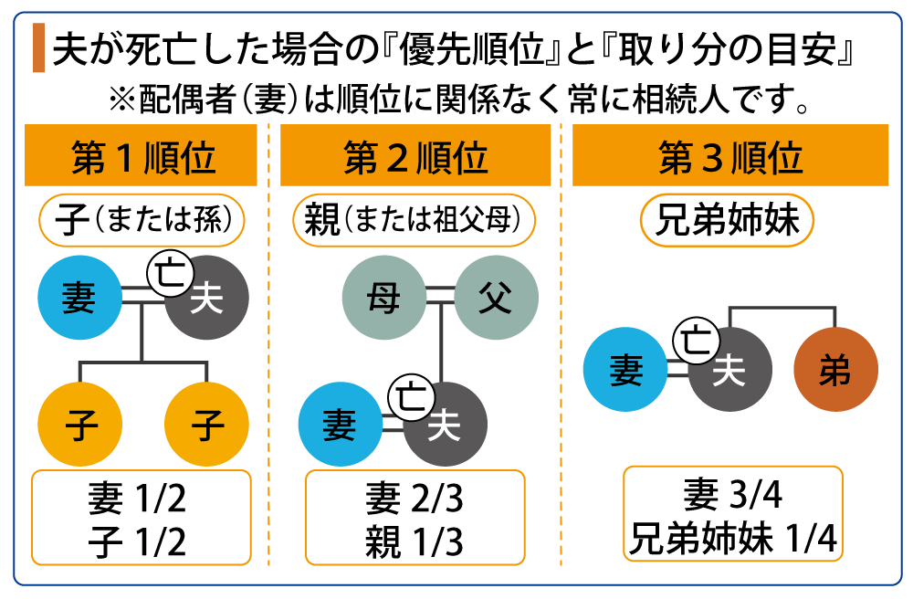 配偶者は常に相続人で、更に子がいれば子も相続人になり、子がいなければ親、子も親もいなければ兄弟姉妹の順番です。